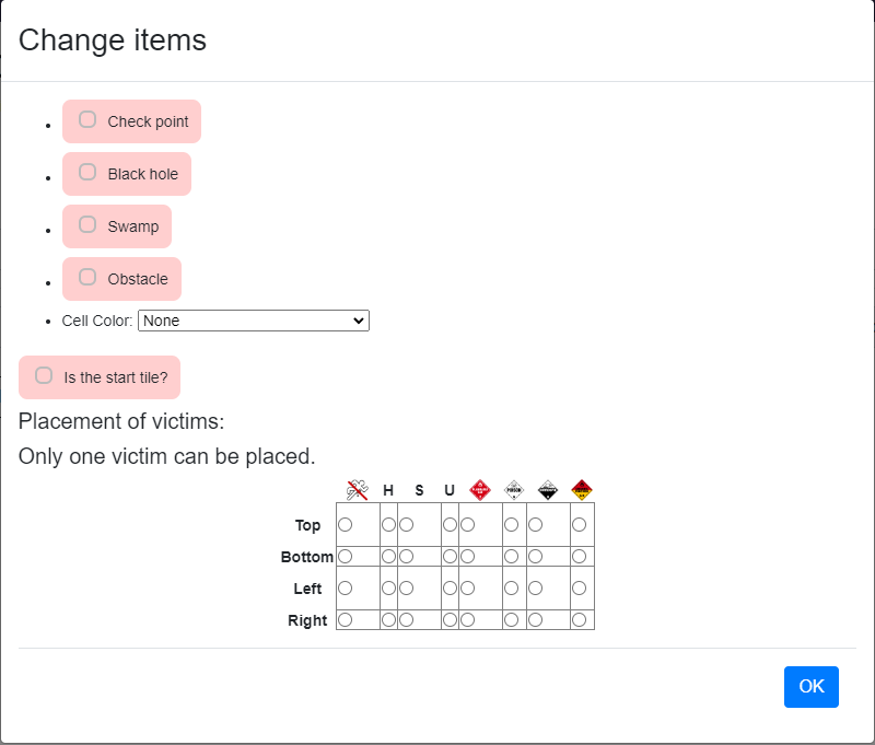 | victim matrix | Provides a matrix with which victims can be placed in all 16 possible positions. The small map above serves as a guide to where the victims are placed. To remove a victim from a position, you have to tick the box at the bottom (the crossed out stick figure). Be aware that multiple victims per tile can be placed |