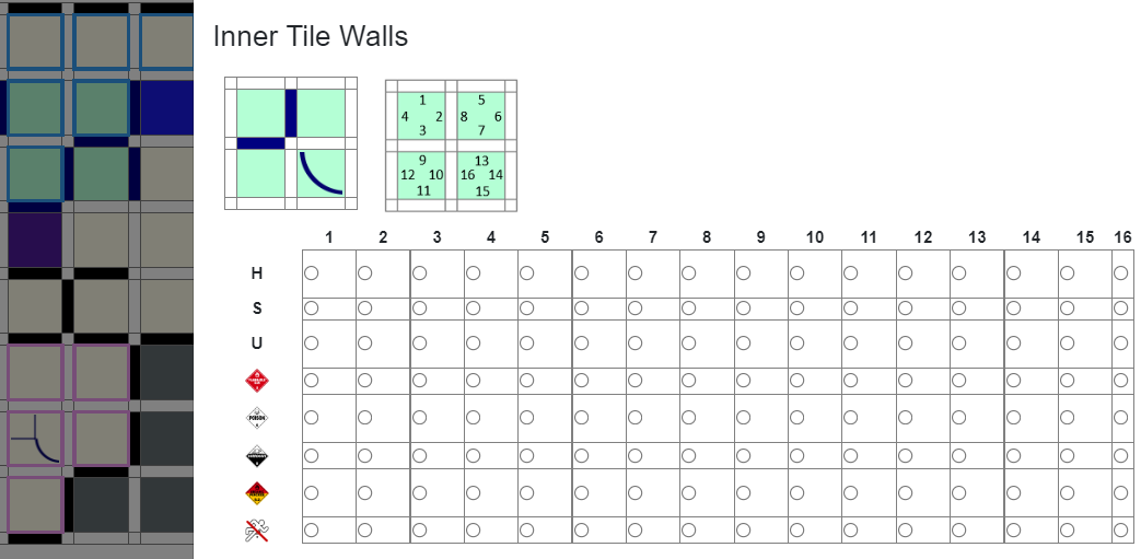 | Empty 2x2 grid | Provides the possibility to place half-walls and curved walls. Clicking on one of the 4 inner walls will add or remove it. Clicking on the quarter-tiles will place/ rotate the curved walls. It also works as a preview for the selected victims. |